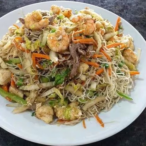 Macarrão bifum: (macarrão de arroz), refogado com carne, frango, camarão, ovos e legumes (acelga, cebola, cenoura e pimentão). Ao molho de curry ou molho a base de shoyu.