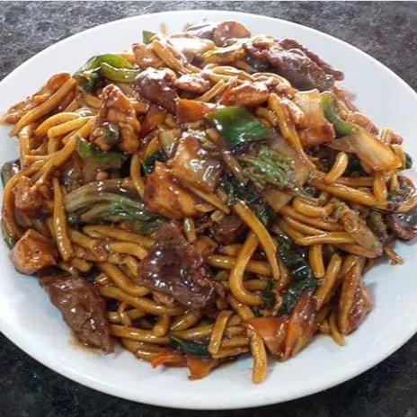 Refogado de carne e frango acompanhado de macarrão tradicional oriental e molho especial a base de shoyu.