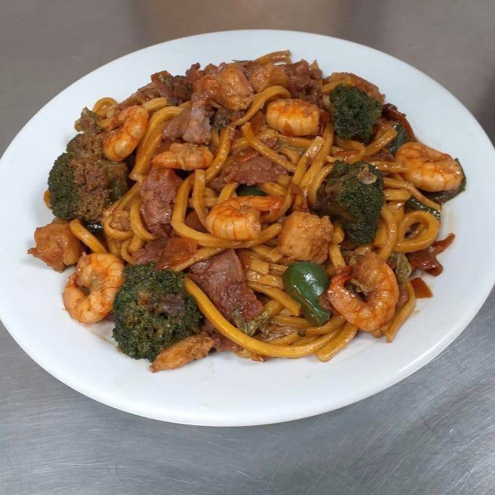 Tradicional macarrão oriental refogado com legumes (acelga, cenoura, pimentão e brócolis), carne, frango e camarão acrescidos de molho especial a base shoyu.