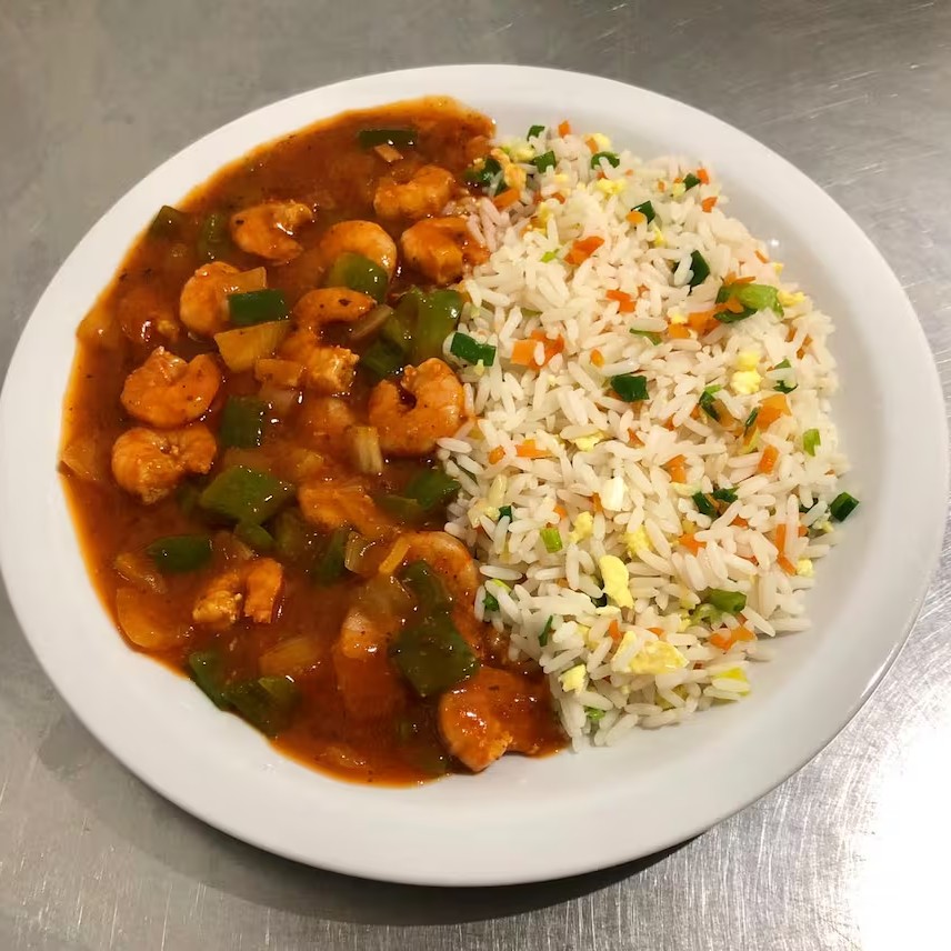 Arroz primavera acompanhado de camarões refogados com cebola e pimentão ao molho de tomate.
