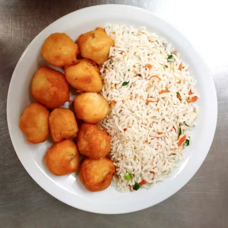 Bolinhas fritas recheadas com cubos de frango e envoltas em uma massa especial. Acompanha arroz primavera ou macarrão oriental ao molho a base de shoyu.