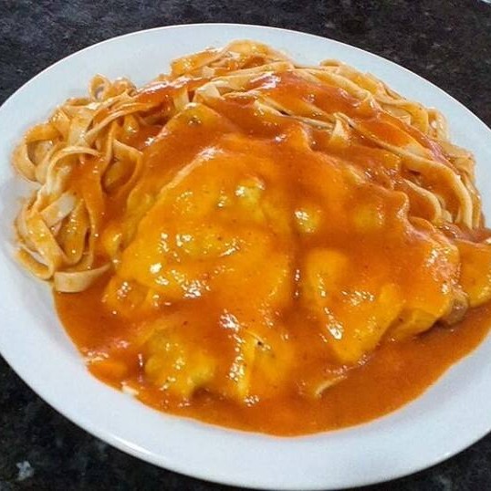 Filé de frango empanado coberto com molho de tomate e queijo mussarela. Acompanha macarrão tradicional oriental ao molho de tomate ou arroz primavera.