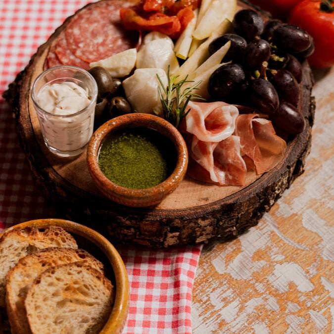 Nossa tábua de frios que você não vai recusar (Mozzarela di búfala, Prosciutto, Salame fatiado, Uvas Vermelhas, Pêra fatiada, Azeitonas pretas, Tomates confit, Molho Pesto genovês, Molho Italian e fatias de Pão Italiano de Fermentação Natural.)