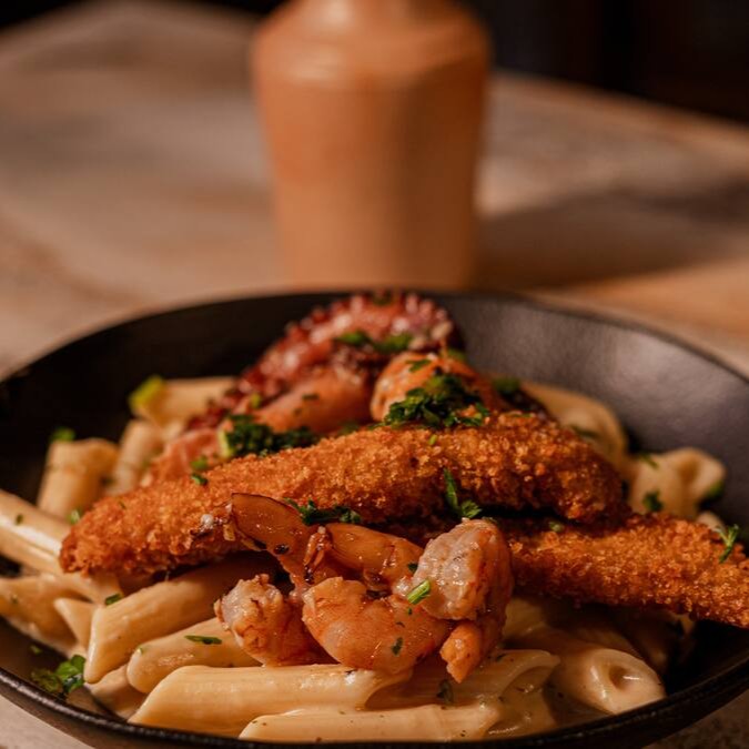 (Molho à base de creme e queijo parmesão, ervas aromáticas e um toque de vinho branco envolvendo a seleção de frutos do mar mais fresca da semana. Ah, e coberto de Parmesão!)