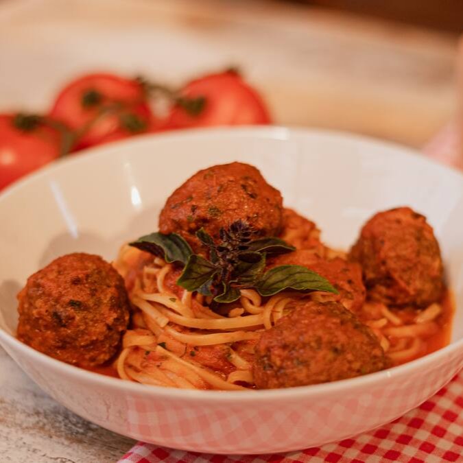 (Almôndegas à moda da casa (150g), preparadas com carne bovina, ervas frescas, lentamente cozidas em um aromático molho de tomates frescos, azeite de oliva e manjericão)