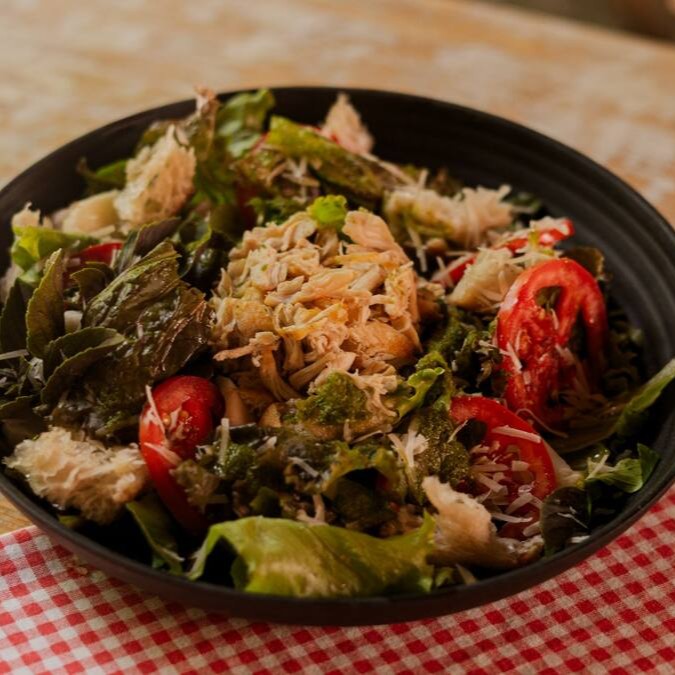 (Mozzarella di Búfala, Tomate italiano maduro, Alface Romana, Rúcula, lascas de Pão italiano de fermentação natural e molho Pesto Genovês como você nunca viu.)