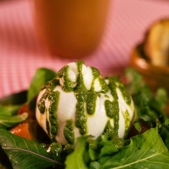 (Burrata Cremosa em leito de Tomate italiano Confit, Rúcula fresca, Pesto genovês e Fatias de Focaccia aquecida e aromatizada com azeite de ervas)