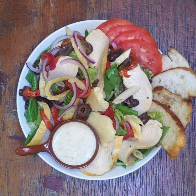 (Frango desfiado, Salame italiano, Azeitonas pretas , Penne grano durum, Parmesão, Tomate Confit, Cebola roxa em finíssimas fatias, Mix de folhas e o autêntico molho Italian.)