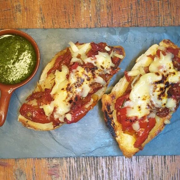 Fatias de pão italianos tostados no azeite e alho, tomates confit, parmesão massaricado e molho pesto genovês