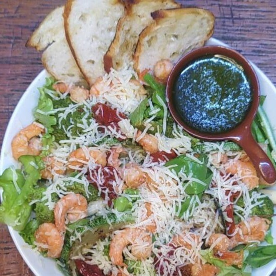 (Camarão, penne grano durum, Mix de folhas, brócolis, abobrinha grelhada, parmesão ralado e molho pesto genovês autêntico.