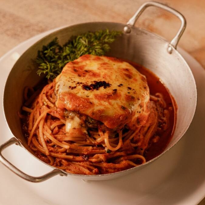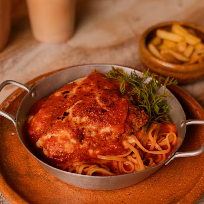 (Filé Mignon suculento, empanado e gratinado com uma generosa camada de molho de tomates frescos, queijo Parmesão e mussarela derretida. Acompanha fritas porque a alma é italiana mas o Coração é brasileiro <3)