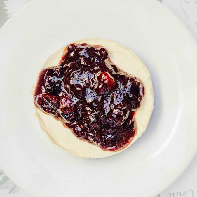 Cheesecake de Castanha com Geleia pedaçuda de Frutas Vermelhas da casa. (Sem trigo. Sem soja. Contém Oleaginosas.)