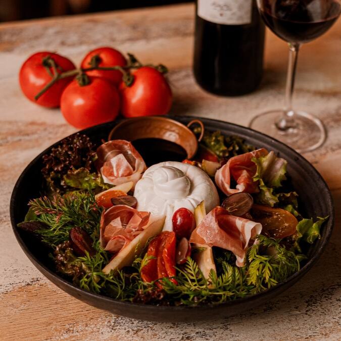 (Burrata fresca, Pêra Fatiada, Prosciutto em lâminas, Tomate Confit, Uvas Vermelhas Mix de folhas e Caramelo Balsâmico.)
