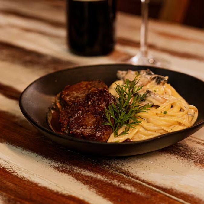 Filé mignon em tiras, cogumelos funghi, molho madeira e rúcula fresca.
