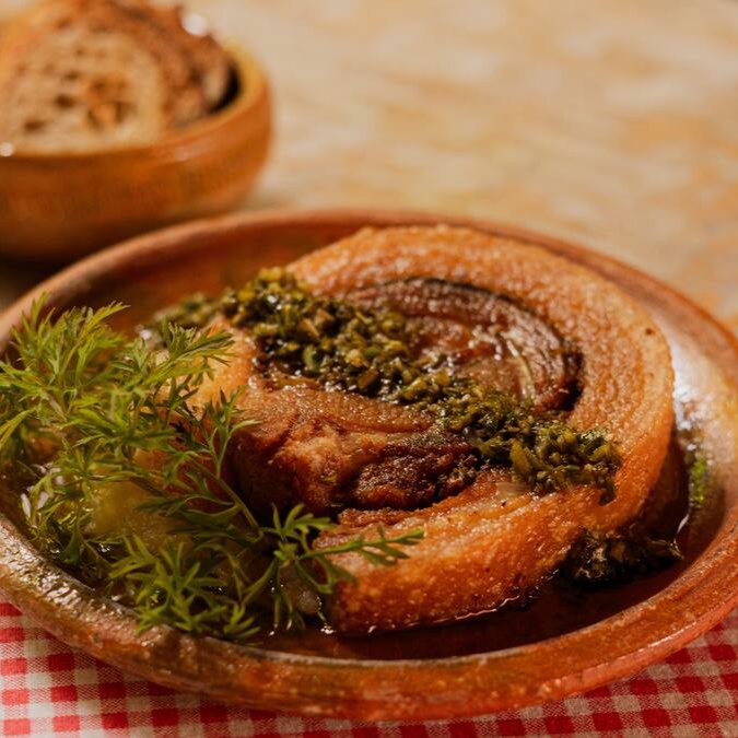 (Nossa versão da Panceta suína mais amada da Itália, coberta de gremolata e acompanhada de fatias de Pão Italiano de Fermentação Natural.)