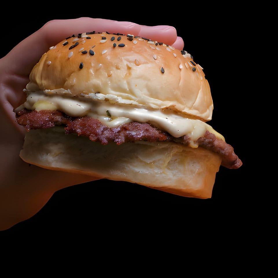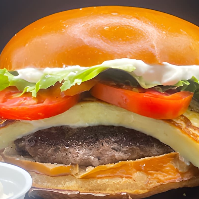 Pão artesanal, carne angus artesanal 90gr, 3 Queijos Muçarela, Prato e Cheddar, Alface americana e Cebola caramelizada. Molho especial da casa