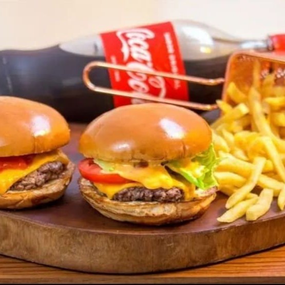 Ideal para dividir com seu parceiro(a) são dois deliciosos hambúrgueres de 3 queijos mais duas porções de batata frita media 200gr + guarana Anrtartica 1 litro.