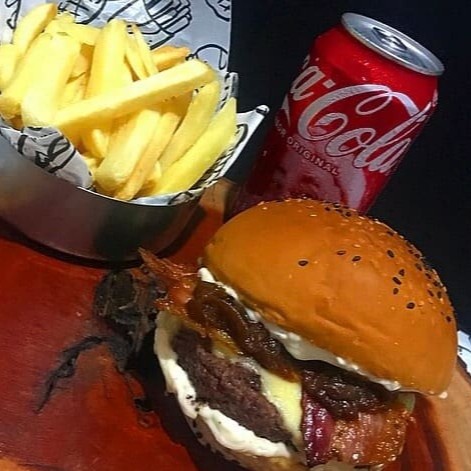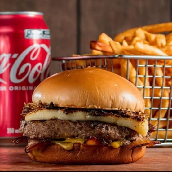 Pão artesanal, carne artesanal 100g, queijo muçarela, Bacon fateado, cebola caramelizada e molho especial da casa. 220g de Batata Frita e Refrigerante em lata.