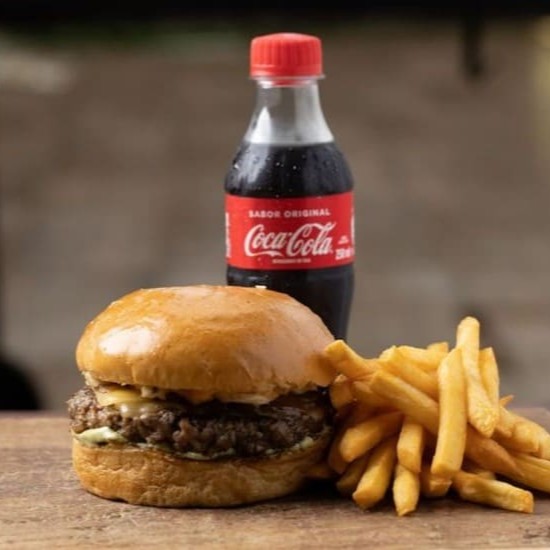 Acompanha 1 Burguer três queijos + batata M + coca cola 250ml.