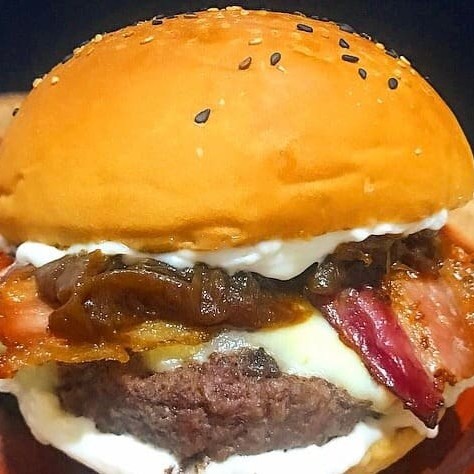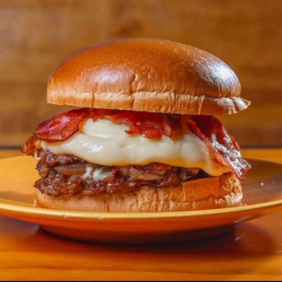 Pão artesanal, carne artesanal 80gr, queijo muçarela, bacon em Fatia, Alface Americana, cebola caramelizada e molho especial da casa.