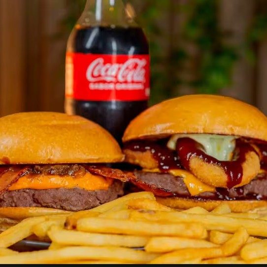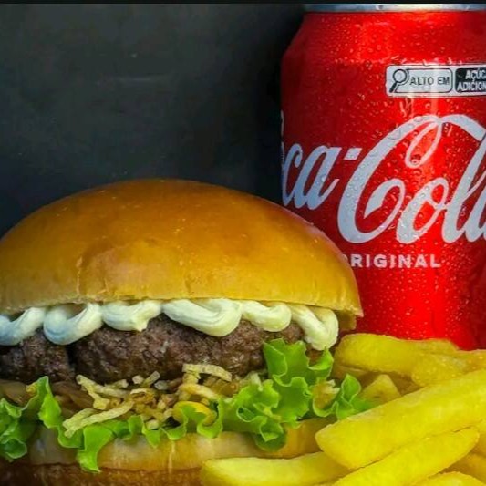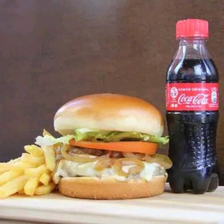 Pão especial, carne artesanal 120g,molho cheddar, verduras (cebola caramelizada) e molho especial +batata frita+Coca cola lata
