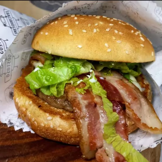 Pão brioche amanteigado ,um delicioso e suculento brend 90g,queijo mussarela,bacon bem assadinho,molho cheddar, verduras bem fresquinhas com a cebola caramelizada no shoyu e um delicioso molho especial