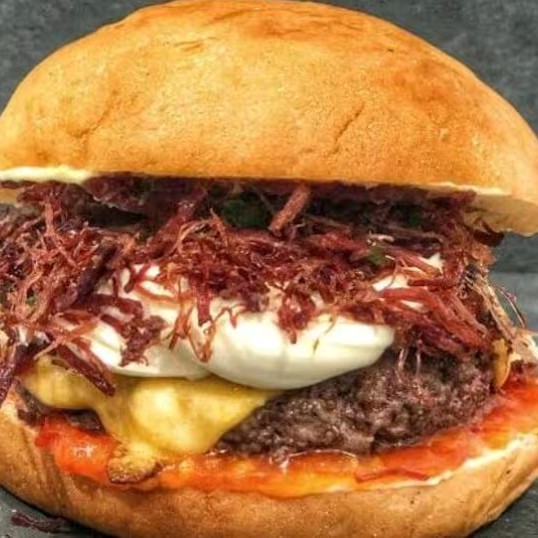 Pão brioche amanteigado ,um delicioso e suculento brend 90g,queijo coalho bem assadinho com uma deliosa porção de charque assada,molho cheddar, verduras bem fresquinhas com a cebola caramelizada no shoyu e um delicioso molho especial