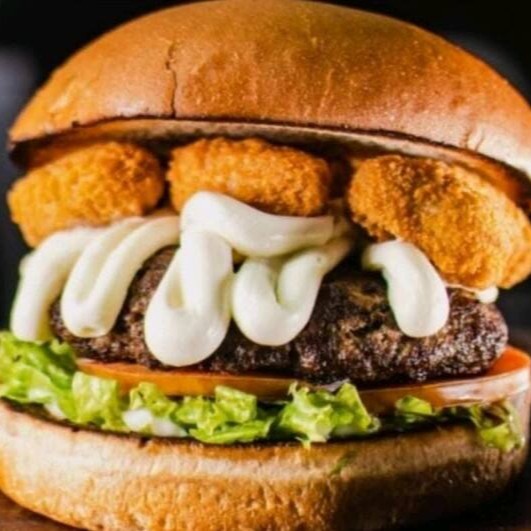 Pão brioche amanteigado ,um delicioso e suculento brend 90g,uma delíciosa porção de nuggts,queijo mussarela,molho cheddar, verduras bem fresquinhas com a cebola caramelizada no shoyu e um delicioso molho especial