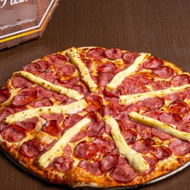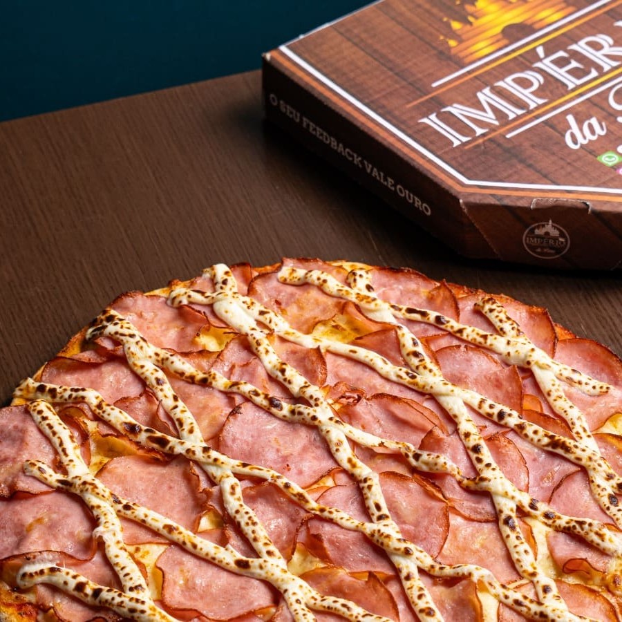 Molho de tomate artesanal, mussarela, lombo canadense, Catupiry