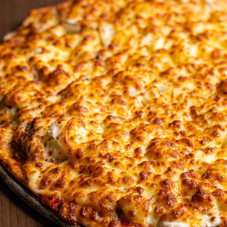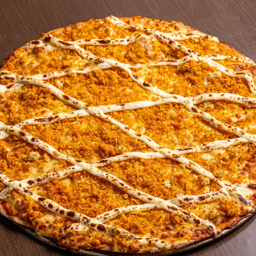 Molho de tomate artesanal, queijo mussarela, frango desfiado e cheddar