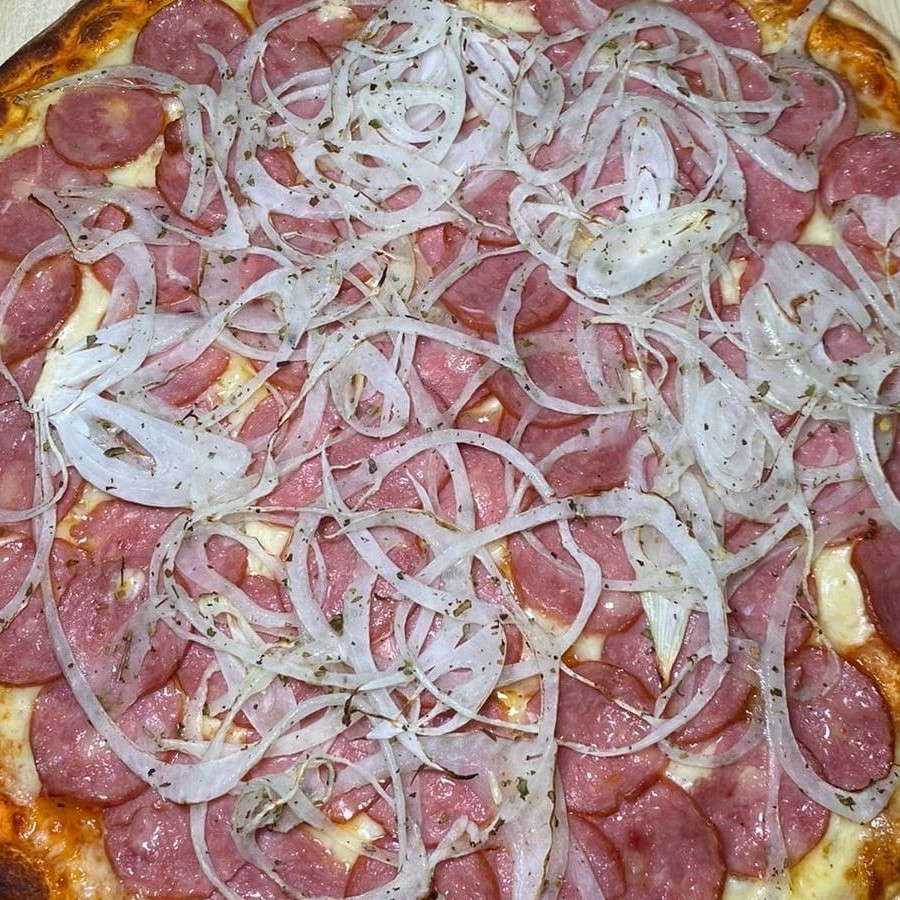 Molho de tomate artesanal, mussarela, calabresa, cebola e oregano.