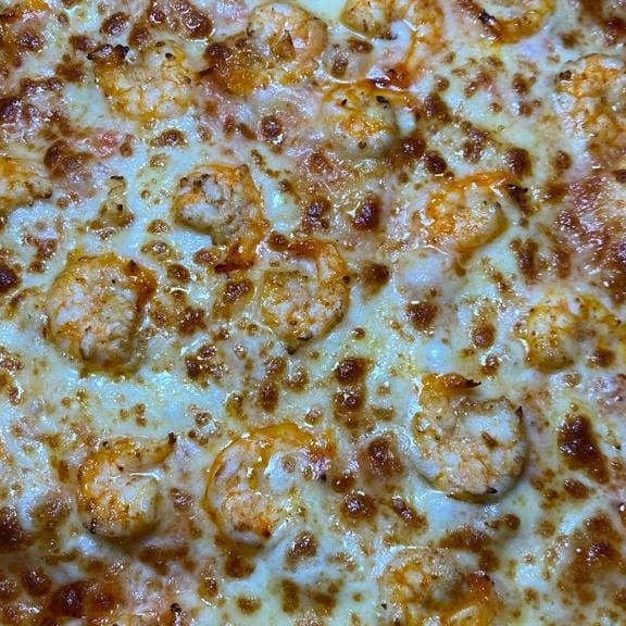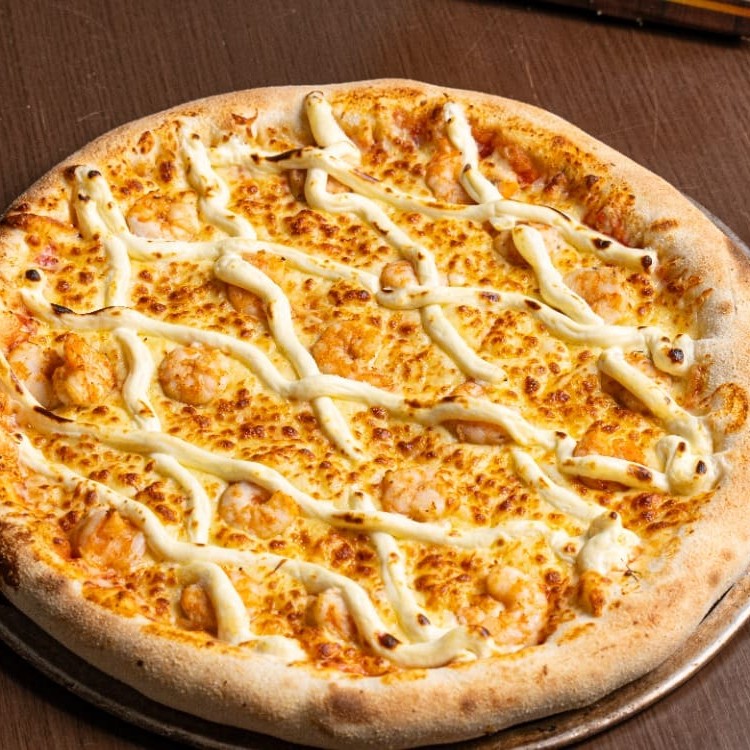 Molho de tomate artesanal, queijo mussarela, camarãoe Cream Chesse