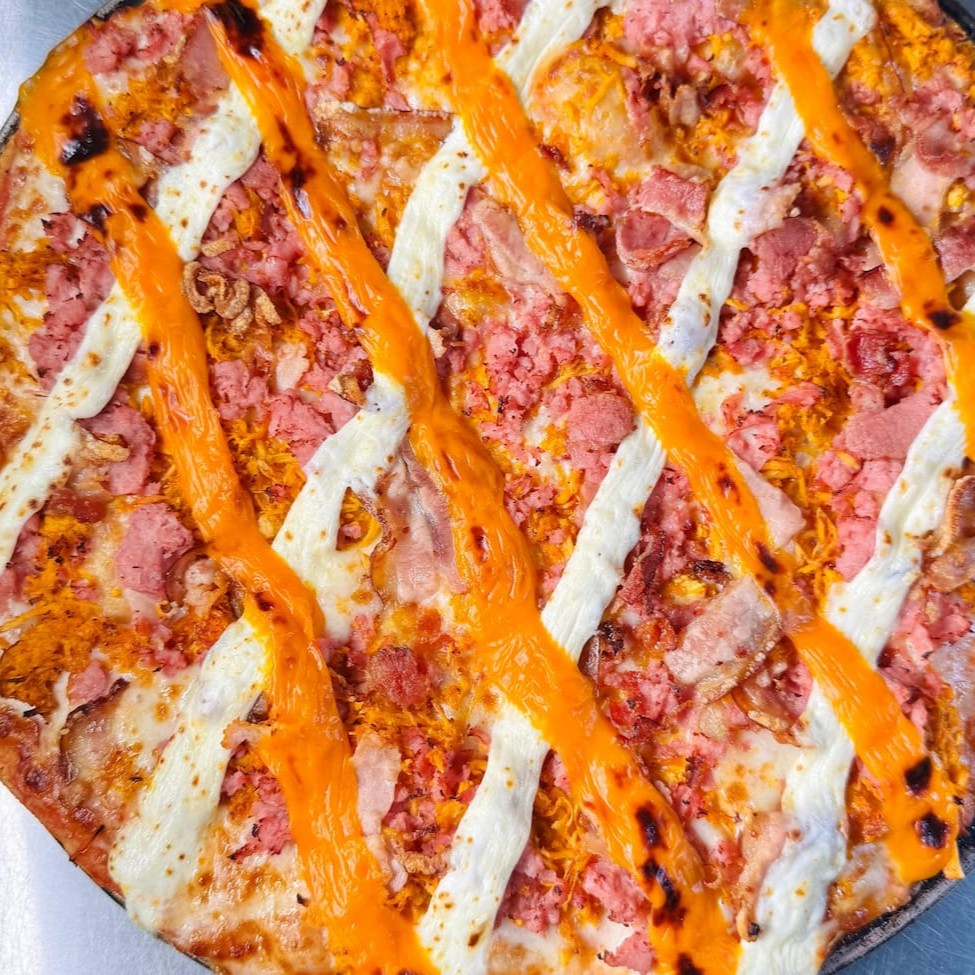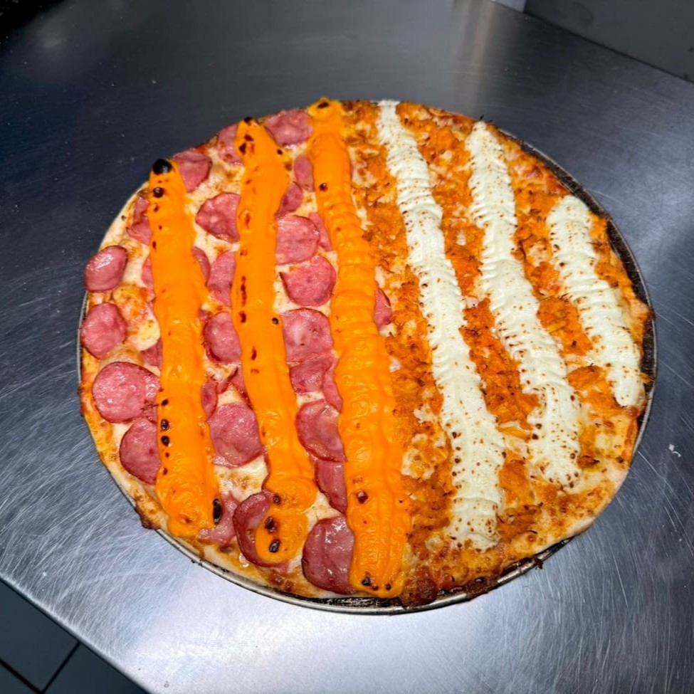 Molho de tomate artesanal, Queijo mussarela, presunto, frango, bacon, Catupiry e cheddar