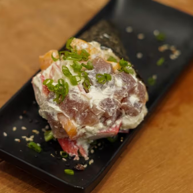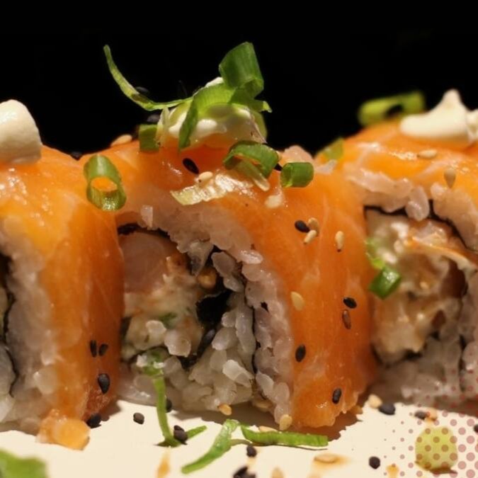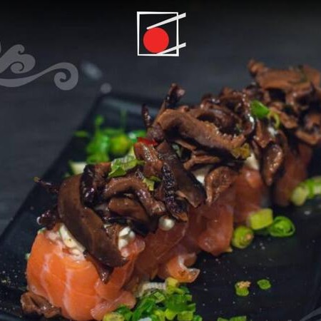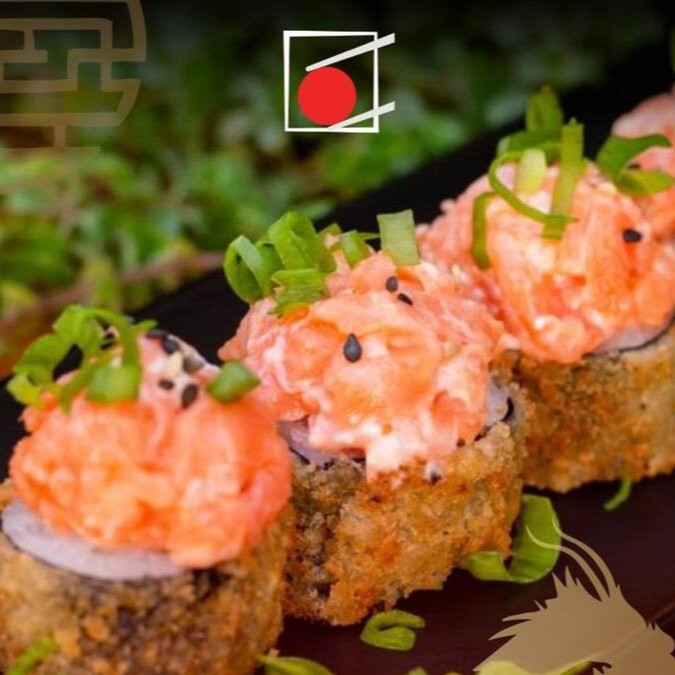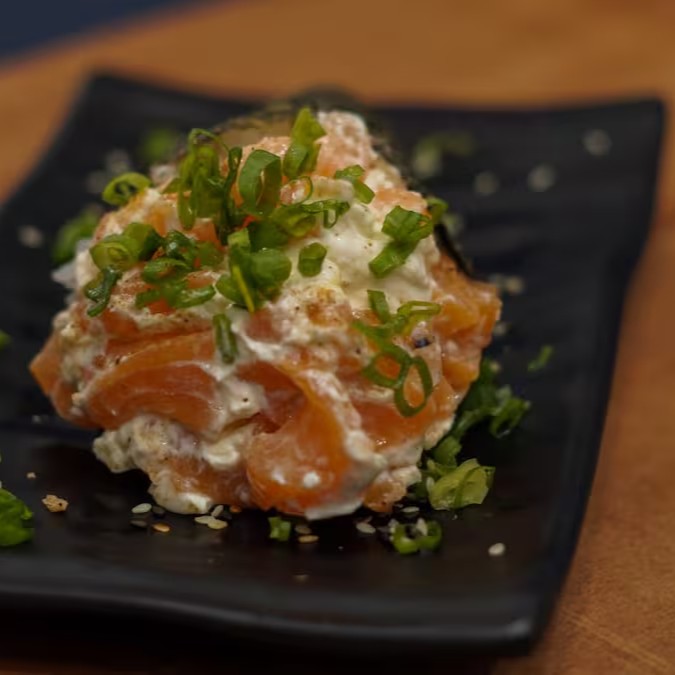 Sushi frito na farinha panko , com recheio de arroz, cream cheese e salmão e encima uma deliciosa pasta de salmão batido com cream cheese e cebolinho.