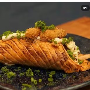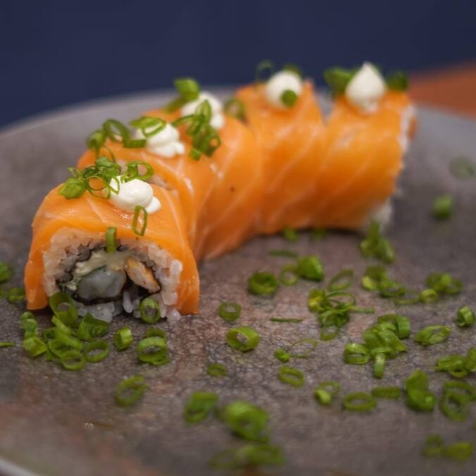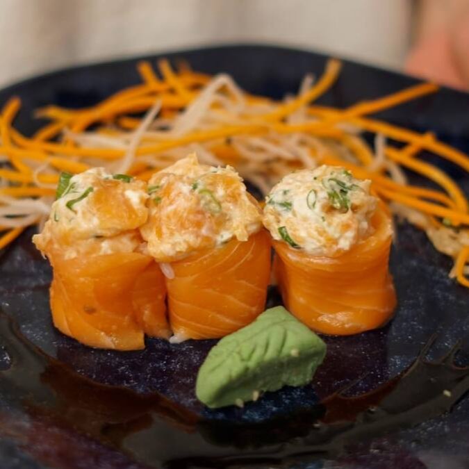Lâmina de Salmão , arroz , cream cheese, cebolinho e recheio de salmão natural ou maçaricado.