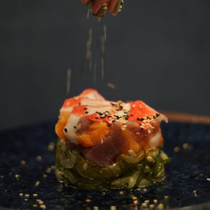 Alga,arroz, salmão em cubos, cebolinho e gergelim.