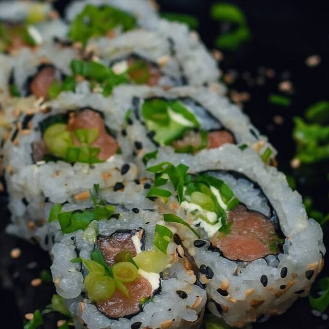 Alga,arroz, salmão em cubos maçaricado,cream cheese, cebolinho e gergelim.