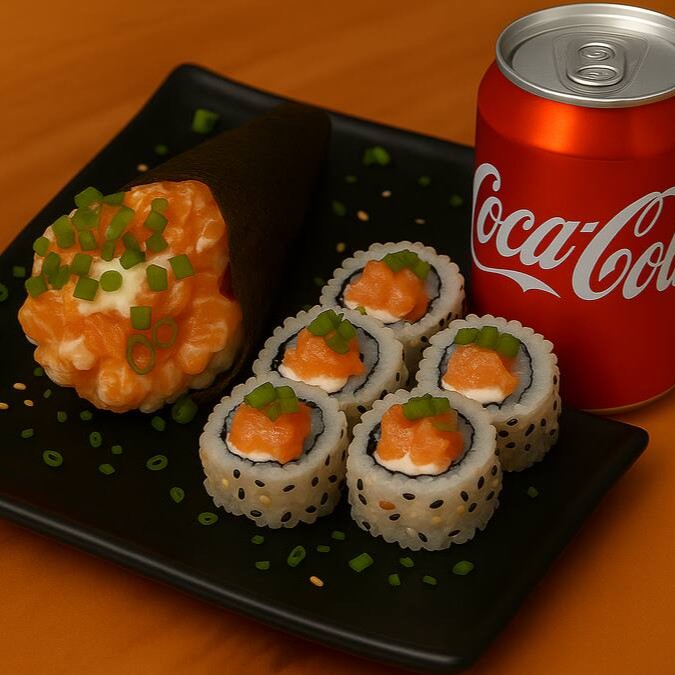 5 unid. Carioca de Salmão , 5 unid. Carioca de Camarão , 10 unid. Uramaki Salmão Pasta , 10 unid. Uramaki Ebi Crock e 5 unid. Jô Jô. + Coca Cola
