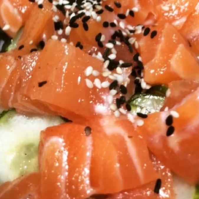 Salada de Pepino, marinada no Molho agridoce , com salmão em cubos e gergelim.