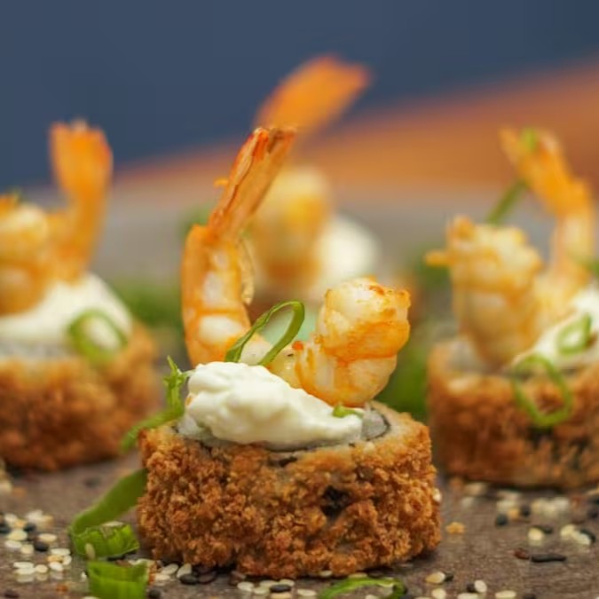 Arroz em volta , cream cheese, camarão empanado,cebolinho e gergelim.