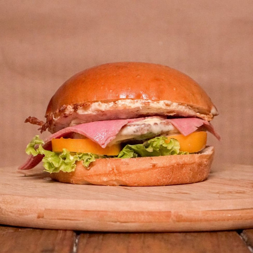 Pão de Hambúrguer, hambúrguer, presunto, ovo, alface, tomate e molho especial.
