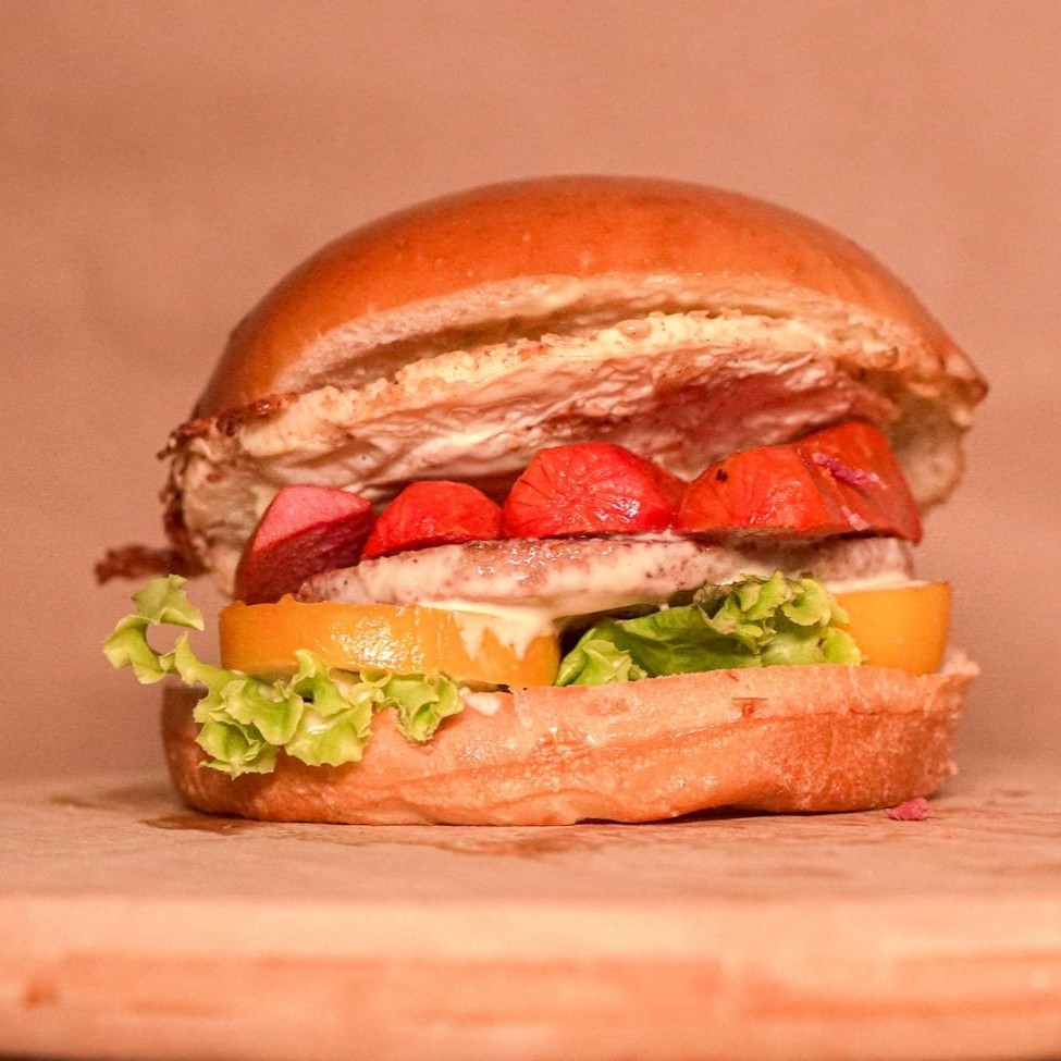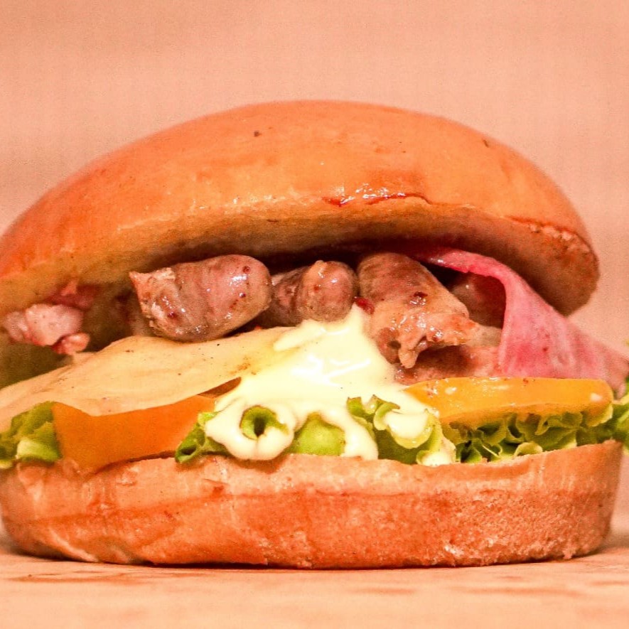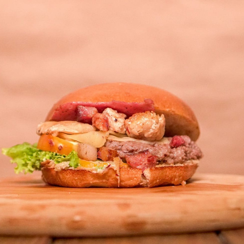 Pão de Hambúrguer, Hambúrguer, Coração de frango, Queijo, Presunto, Alface, Tomate e Molho Especial.