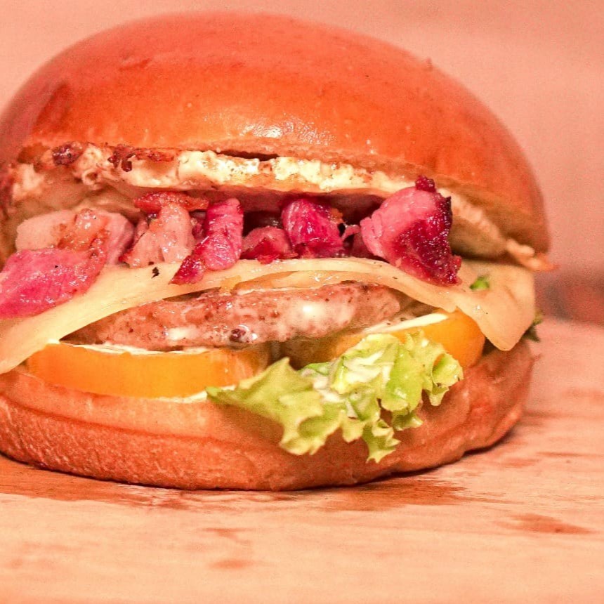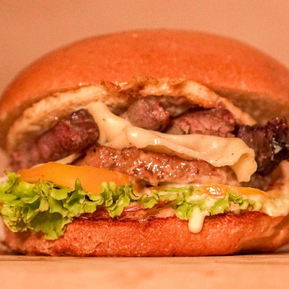 Pão amanteigado, hamburguer, filé de carne em tiras, bacon, queijo, presunto, molho barbecue, molho especial, tomate e alface. (imagem ilustrativa)