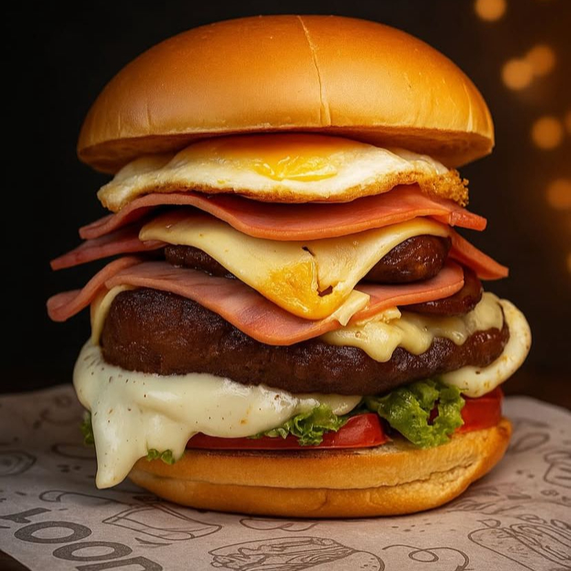 Pão de hambúrguer, 2x hambúrguer caseiro(120g), 2x queijo, 2x presunto, salsicha, bacon, calabresa, ovo, milho, ervilha, alface, tomate e molho especial (imagem ilustrativa)