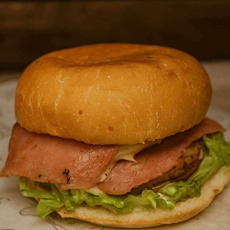 Pão, Hambúrguer Caseiro (120g), Queijo, Presunto, Molho Especial, Tomate e Alface.