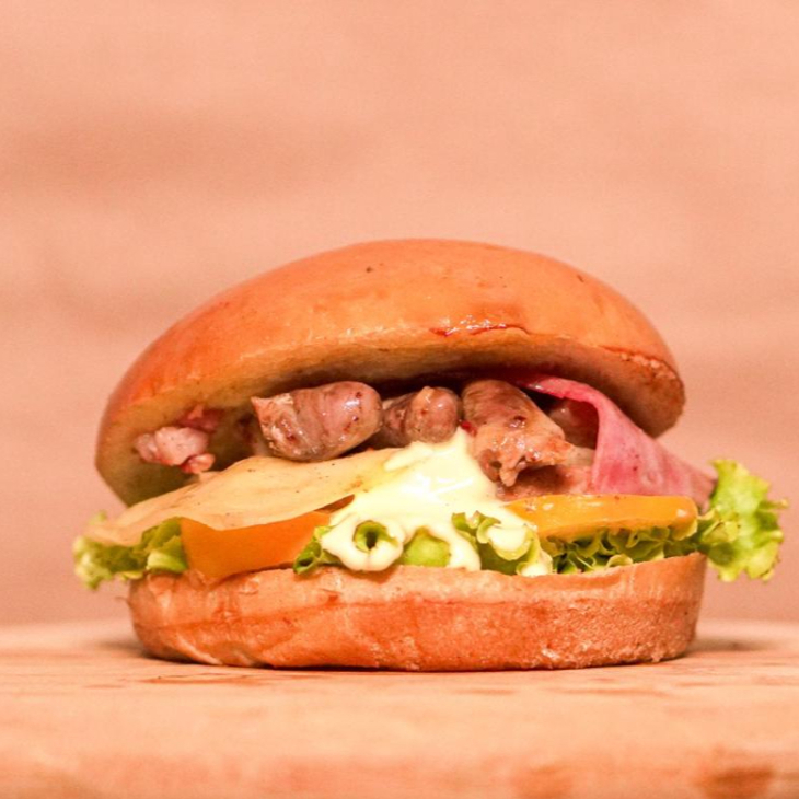 Pão de hambúrguer, hambúrguer caseiro(120g), coração de galinha, queijo, presunto, alface, tomate e molho especial