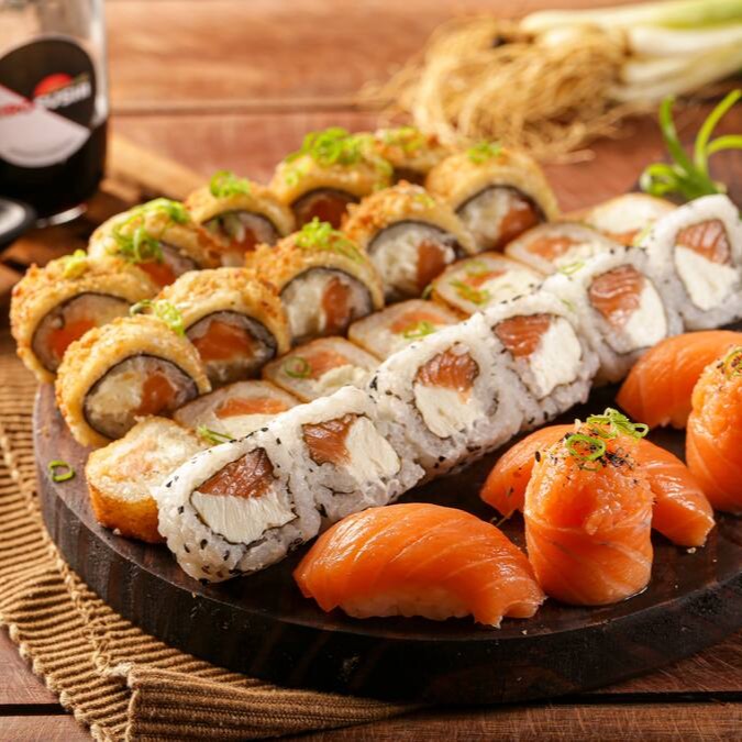 Super combo composto por 10 deliciosos Cariocas de Salmão, 10 Uramaki de Salmão, 10 Hot de Salmão 2 Joyjoy e 3 Niguiri de salmão.