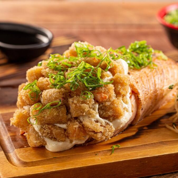 Deliciosamente preparado Salmão, Camarão cozido, Cream Cheese Original, Arroz Japonês e finalizado com Farinha Japonesa. Suculento por dentro e crocante fora.