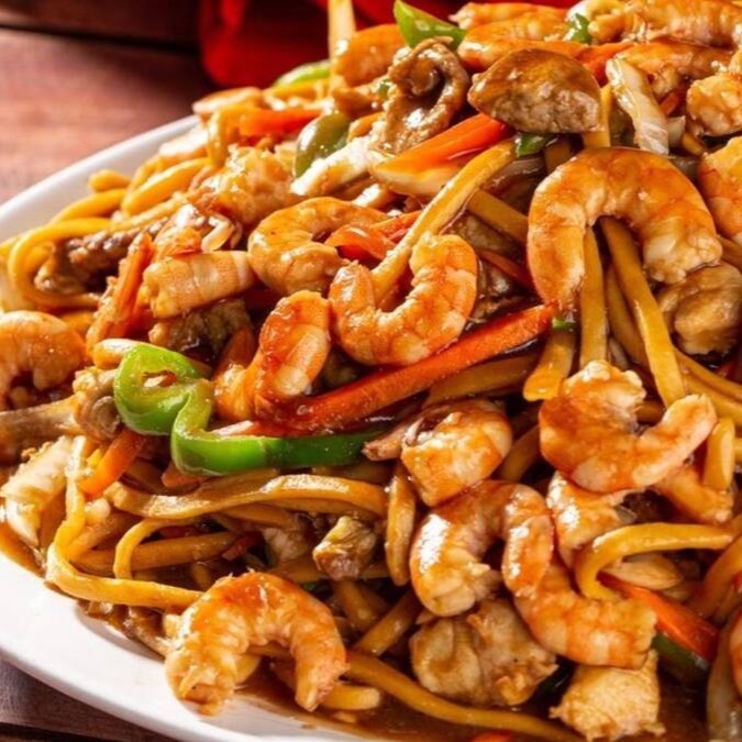 Deliciosamente preparado com Macarrão frito, Carne e Frango ao Molho de Soja.