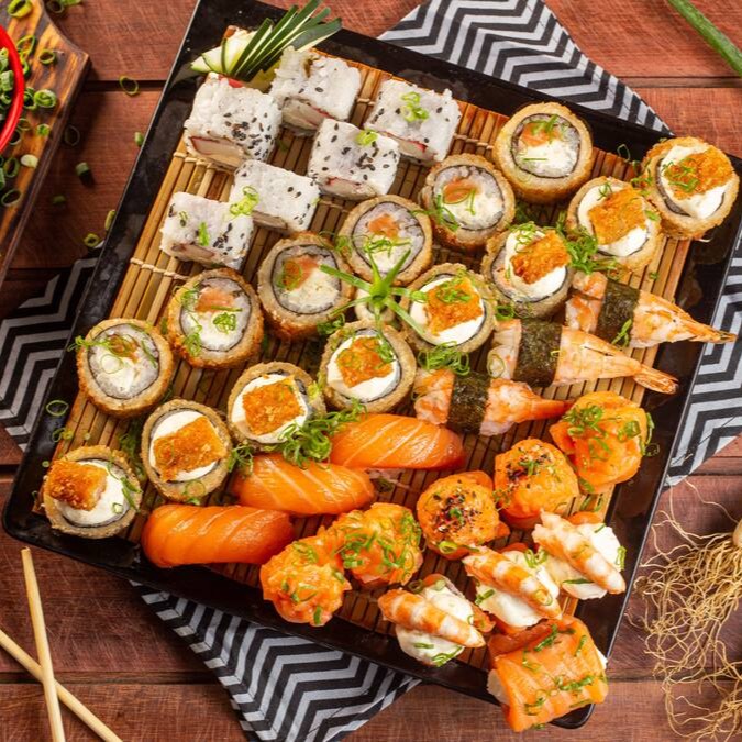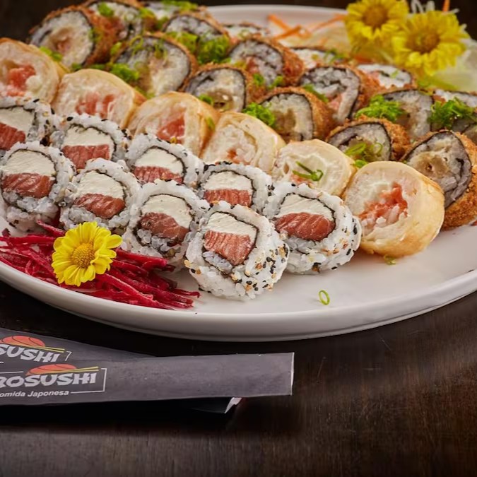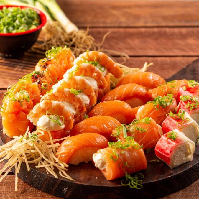 Um Combo delicioso composto por 20 Cariocas de Salmão, 10 Uramakis de Salmão, 10 Uramaki de Kani, 10 Hossomaki de Kani, 5 Niguiri de Salmão, 5 Niguiri de Atum, 5 Laminas de Sashimi de Salmão e 5 Eby Joy.
